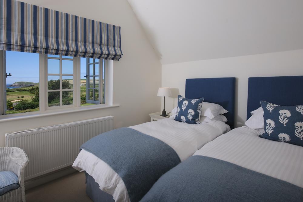 Zip & link super king bed (can be twin beds). Built in shelved and hanging cupboard.Wonderful sea views.