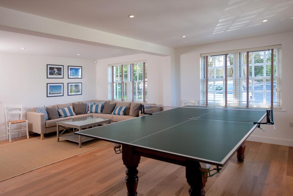 Oak flooring, table tennis table, large corner sofa and wall-mounted flat screen TV with PS3 and DVD player. An extra 4-drawer deep freeze is tucked away under the stairs.