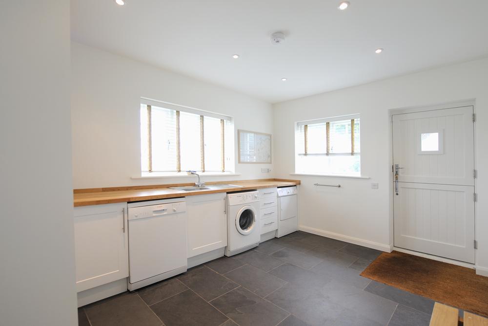 Slate tile floor, wooden worktops, sink, base units, a tall storage cupboard.There is a washing machine, tumble dryer and dishwasher.