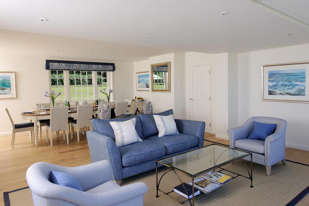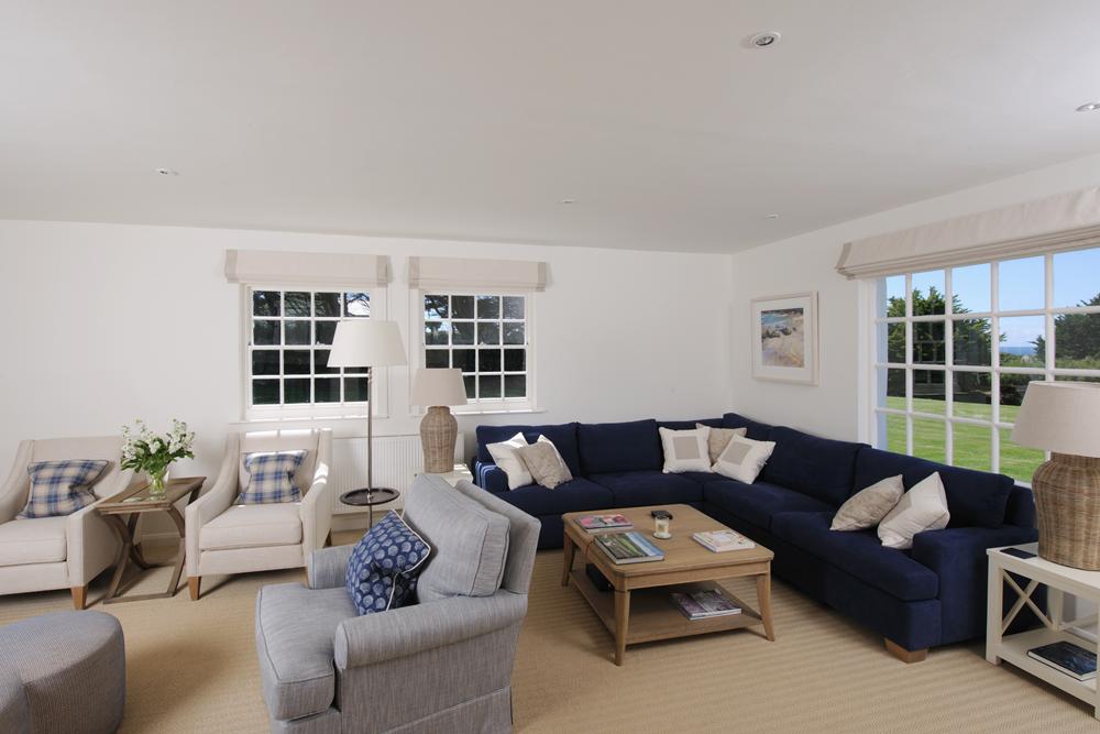 This light and spacious open plan room features floor to ceiling folding glass doors which open onto the terrace and garden with wonderful views of the sea and the golf course.